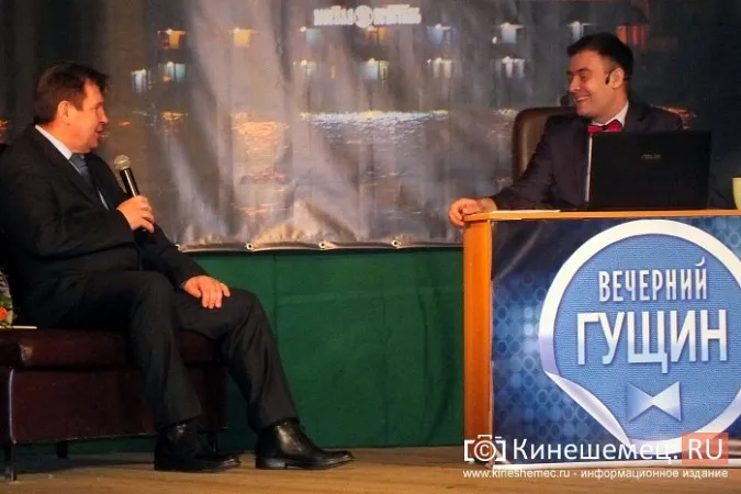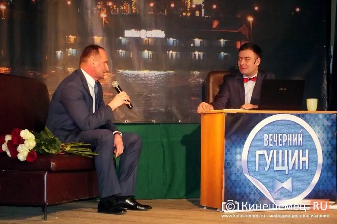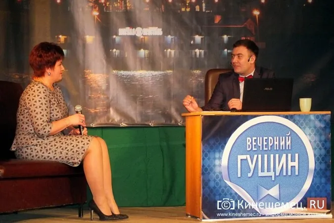 В минувшую пятницу на сотрудники городского Дома культуры решили разыграть на сцене учреждения шоу «Вечерний Гущин» — такой кинешемский аналог популярной юмористической программы с Иваном Ургантом, роль которого на сцене сыграл руководитель ГДК Артем Гущин. Жанр сложный не только для ведущего, поскольку требует постоянной импровизации, но, прежде всего, для официальных лиц, для которых привычный выход к микрофону заменило общение на тему культуры на мягком диване «Вечернего Гущина». А гостями шоу в этот день стали руководители Кинешмы и учреждений культуры города, депутаты городской и областной Думы.