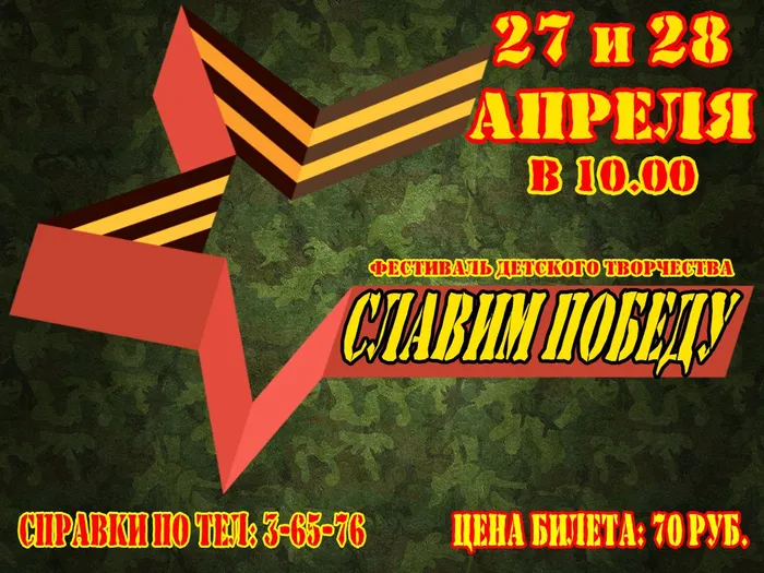 27 и 28 апреля в 10.00 в Городском Доме культуры пройдет патриотический фестиваль "Славим победу!", посвященный 72-летию Победы в Великой Отечественной войне, среди воспитанников детских садов города.