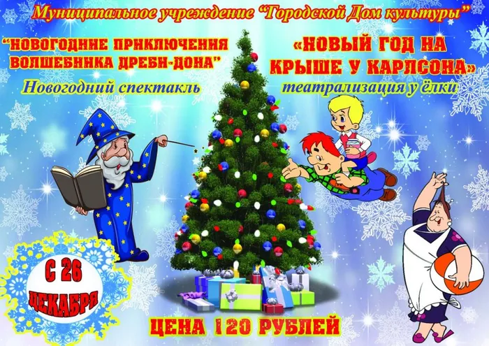 В этом году юных гостей Городского Дома культуры ждет интересная театрализация у ёлки "Новый год на крыше у Карлсона", в которой дети вместе с героями будут воспитывать известную "домомучительницу" Фрэкен Бок, а в финале Дед Мороз со Снегурочкой подарит Малышу собаку, о которой он так долго мечтал. После этого детей ждет увлекательный спектакль "Новогодние приключения волшебника Дреби-Дона", где, как и всегда, злодеи будут строить козни главным героям, мешая наступлению праздника, но, как водится, добро должно победить.