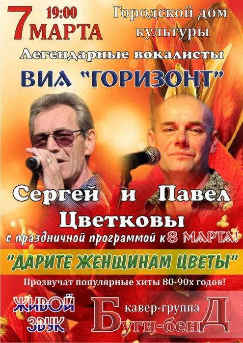 Концерт «Дарите женщинам цветы» подготовлен специально к 8 Марта, в нем будут исполнены хиты 80−90-х годов, а изюминкой праздника станет живой звук в исполнении кавер-группы «Буги-Бэнд». Организаторы не сомневаются, что концерт пройдет в праздничной атмосфере, наполненной ностальгией.