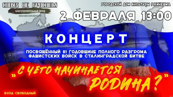 2 февраля в Городском Доме культуры состоится концерт "С чего начинается Родина?", посвященный 81-й годовщине полного разгрома фашистских войск в Сталинградской битве. Начало в 13.00. Вход свободный.