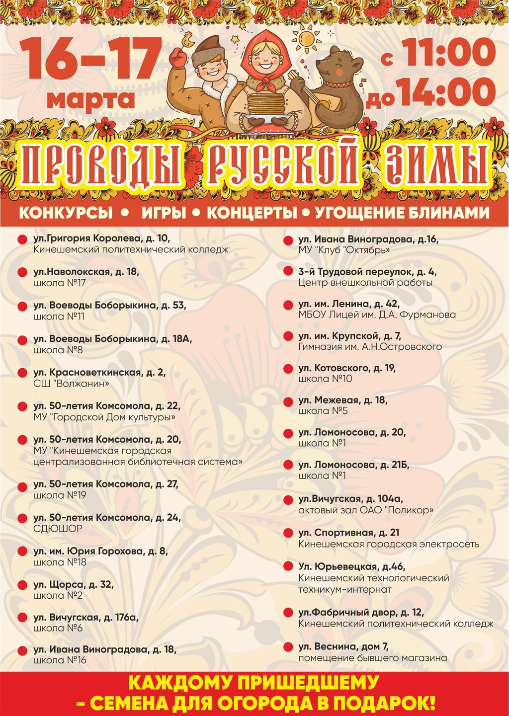 Праздничные программы пройдут с 11.00 до 14.00. Каждому пришедшему – семена для огорода в подарок. Встречаемся на Масленице!