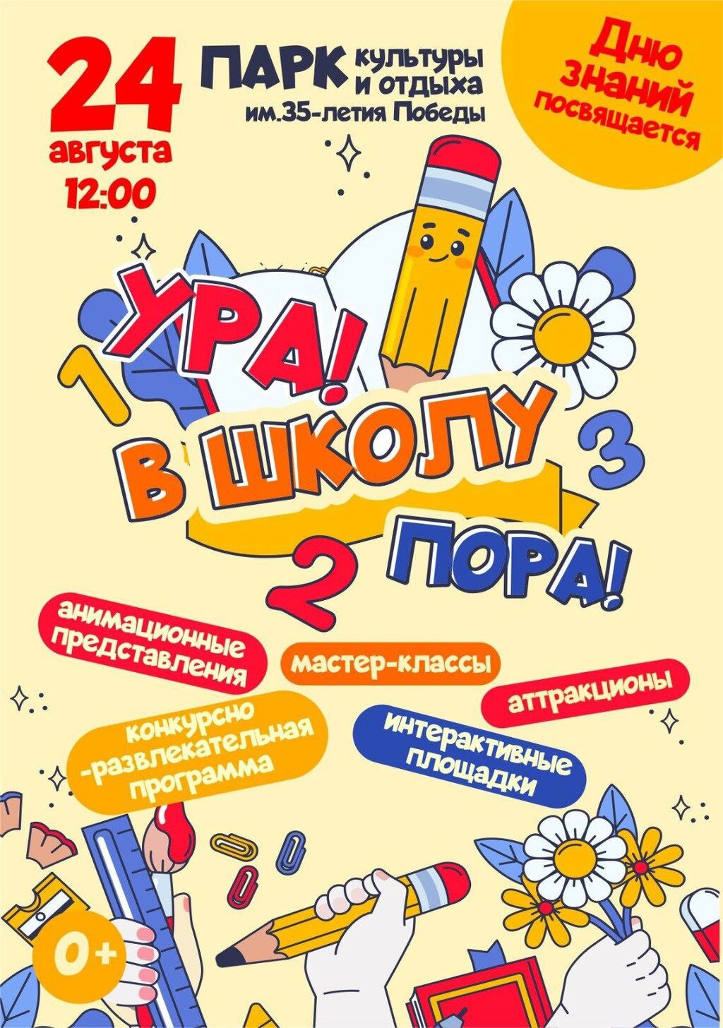 Праздник «УРА! В ШКОЛУ ПОРА!», несомненно, станет ярким и запоминающимся событием, объединившим взрослых и детей. Начало в 12.00.