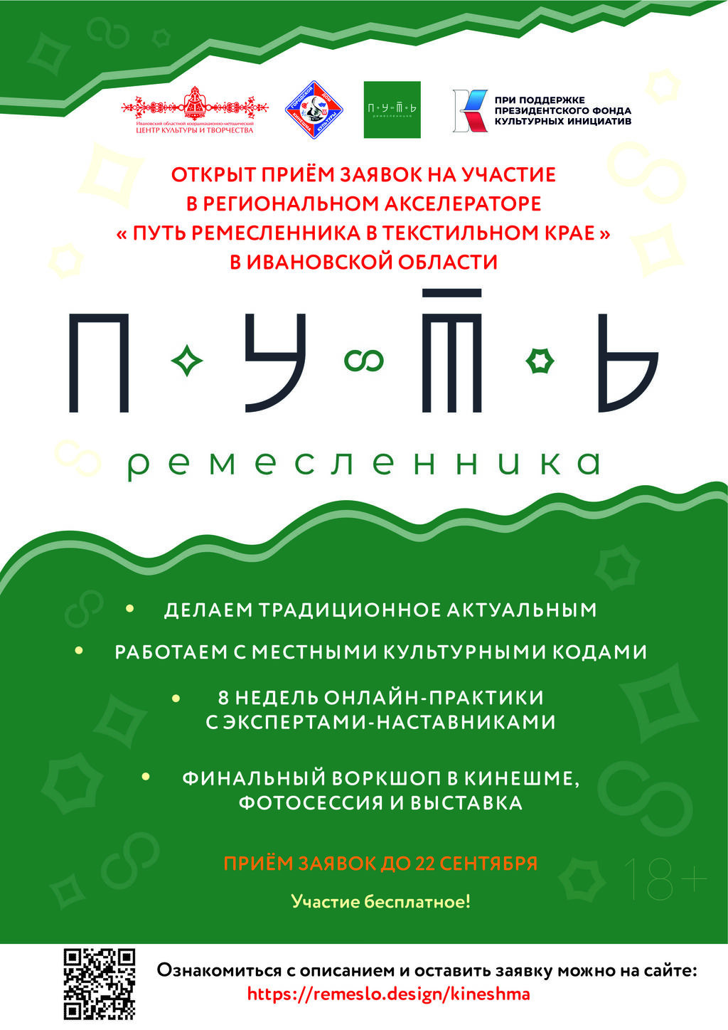 Заполните заявку на нашем сайте и начните свой путь к успеху в компании единомышленников. Участие в акселераторе абсолютно бесплатное. Это ваш шанс сделать шаг к реализации своих идей, получить новые знания и вдохновение для дальнейшего роста! Ждём вашу заявку: https://remeslo.design/kineshma Проект реализуется при поддержке Фонда культурных инициатив.