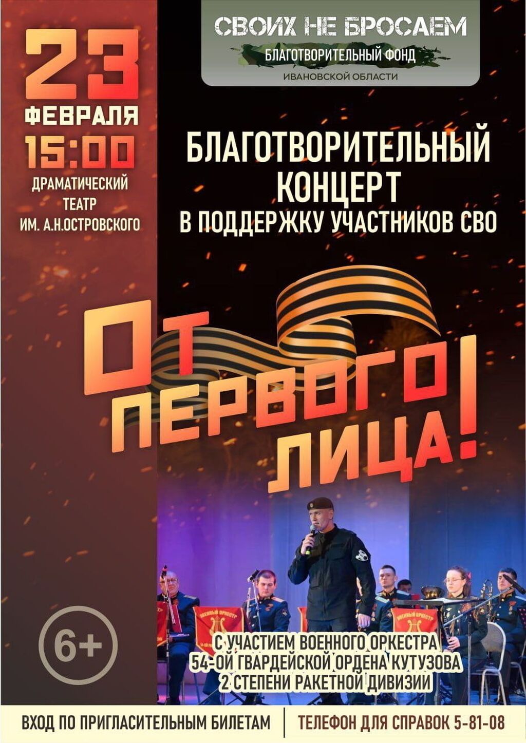 В День защитника Отечества, 23 февраля, в Кинешме состоится большой праздничный благотворительный концерт «От первого лица», организаторами которого выступили благотворительный фонд «Своих не бросаем», администрация города и театр им. А.Н. Островского.