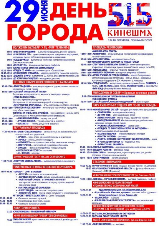 В этом году городу на Волге исполняется 515 лет. Согласно Уставу Кинешмы, в последнюю субботу июня отмечается День города. В 2019 году Кинешма отметит свое 515-летие 29 июня. Основные площадки праздника будут организованы на площади Революции, в Парке культуры и отдыха имени 35-летия Победы, на Волжском бульваре, театральной площади.