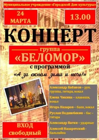 24 марта на сцене Городского Дома культуры пройдет концерт группы «Беломор» Ивановской областной организации Всероссийского общества слепых с программой «А за окном зима и ночь!». Репертуар группы настолько разнообразный, что равнодушным не останется даже самый искушенный зритель.
