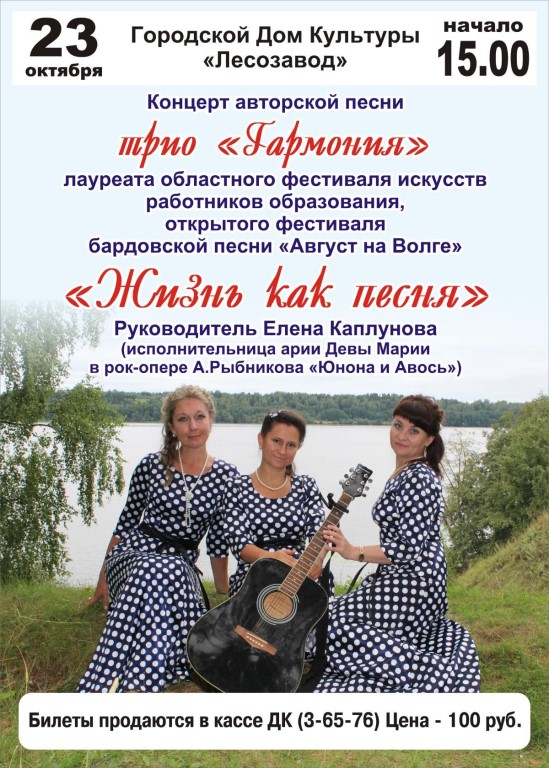 В Кинешме с 23 по 30 октября пройдёт областной фестиваль «Дни Российской культуры». В Городском Доме культуры его торжественно откроет трио "Гармония" своим сольным концертом 23 октября в 15.00.