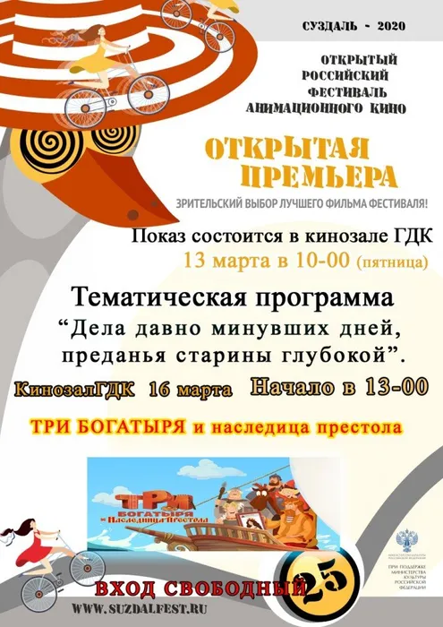 Кинозал ГДК снова принимает в своих стенах фестиваль "Открытая премьера" В этом году Открытый российский Фестиваль анимационного кино в седьмой раз проводит широкомасштабную всероссийскую акцию «Открытая Премьера». За эти годы мероприятие стало традиционным и всенародно любимым.