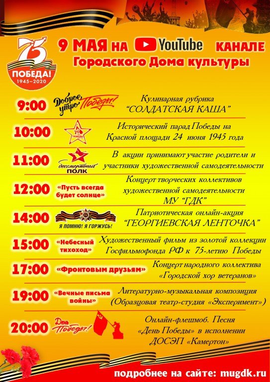 Приближается 9 Мая – праздник, который для нашей страны, для каждой российской семьи был, есть и будет святым, самым главным. Городской Дом культуры представляет вашему вниманию афишу праздничных мероприятий, посвященных 75-летию Победы в Великой Отечественной войне.