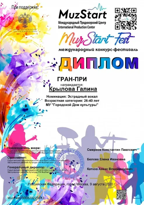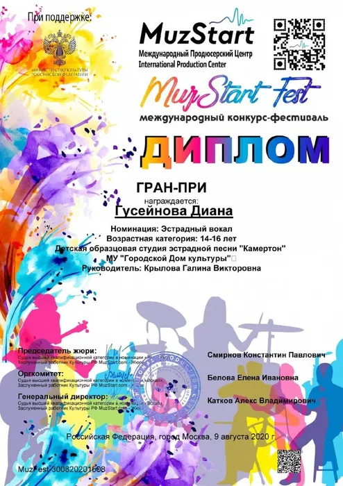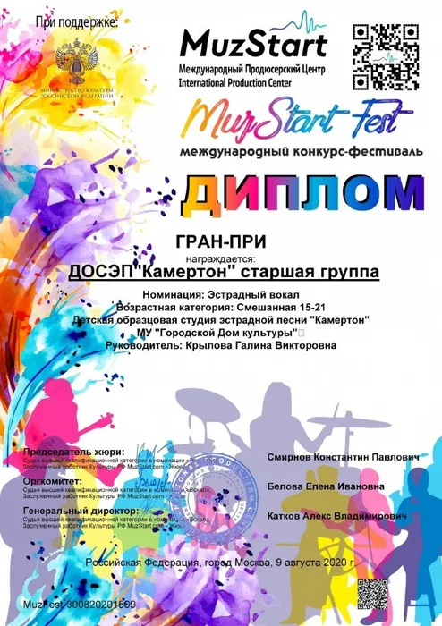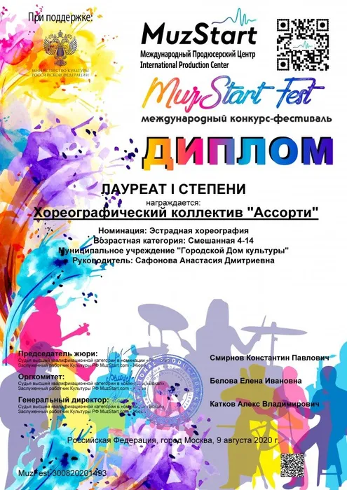 В результате участия в Международных конкурсах, представленных продюсерским центром «MuzStart», наши коллективы завоевали в общем количестве 20 дипломов уровня «Гран-При» и «Лауреата I степени». А именно: