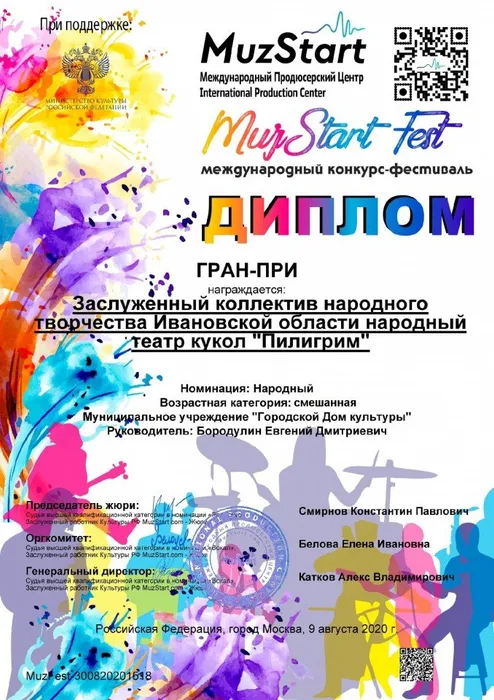 - Заслуженный коллектив народного творчества Ивановской области народный театр кукол «Пилигрим (кукольный спектакль «Краса Ненаглядная») – Гран-При.